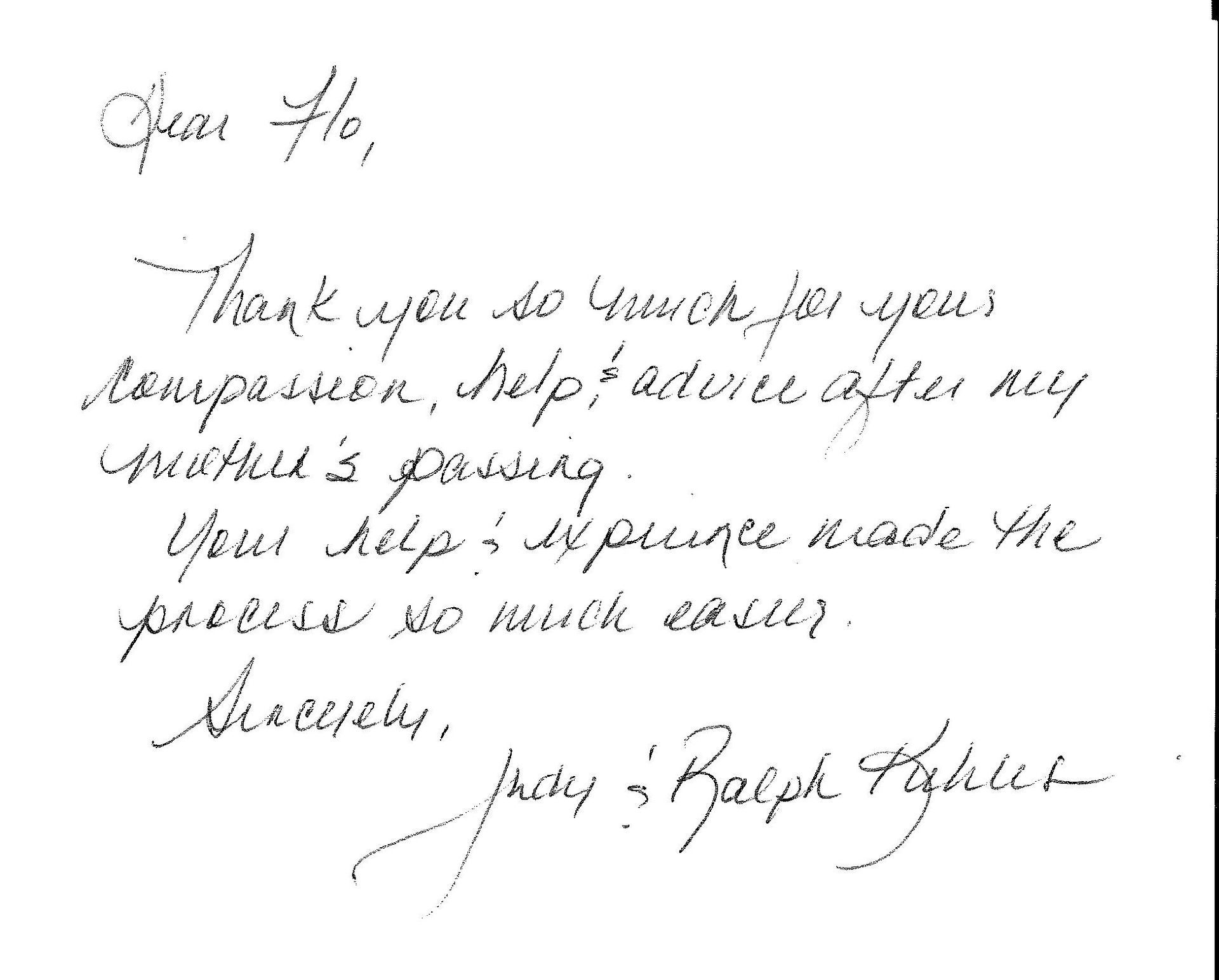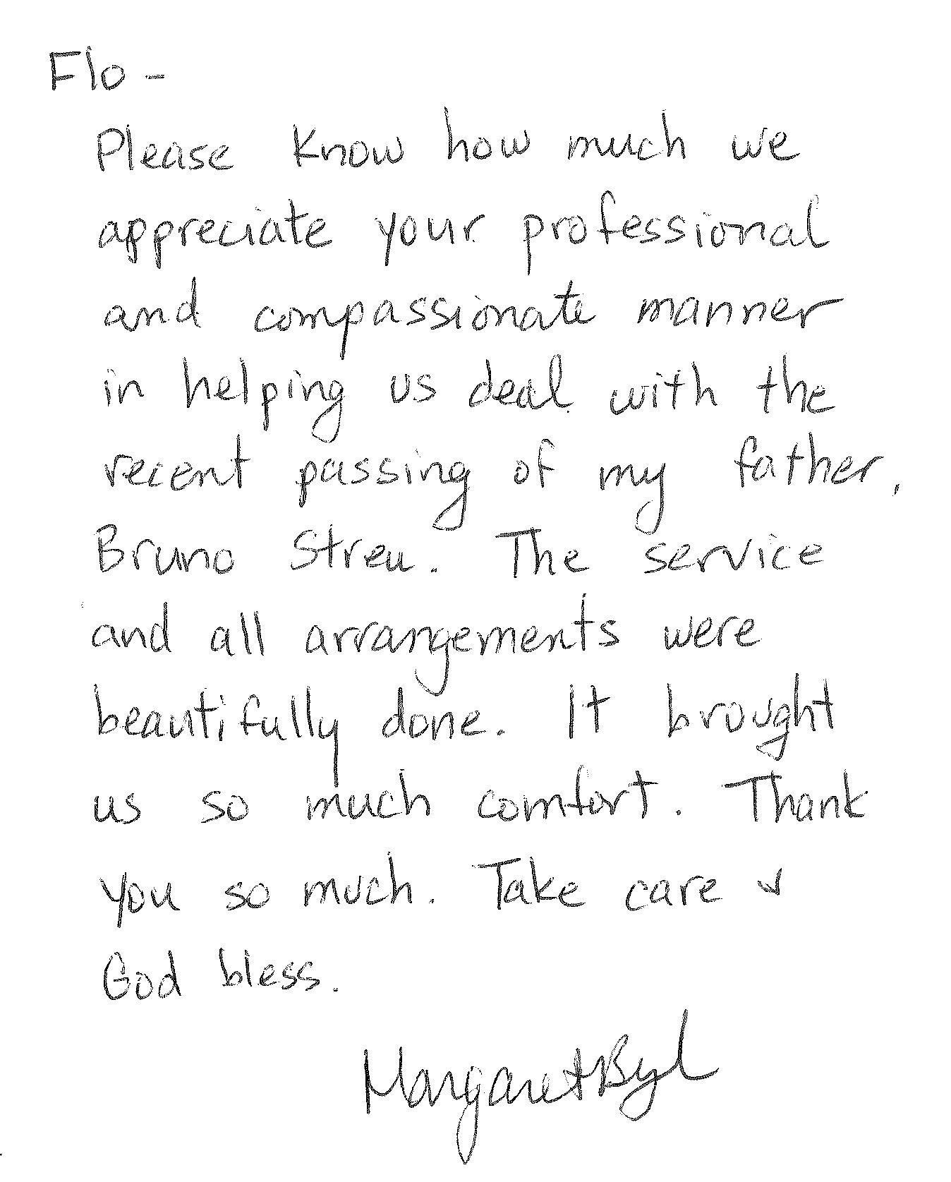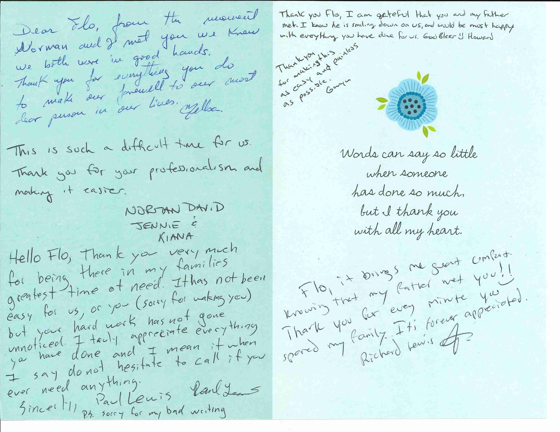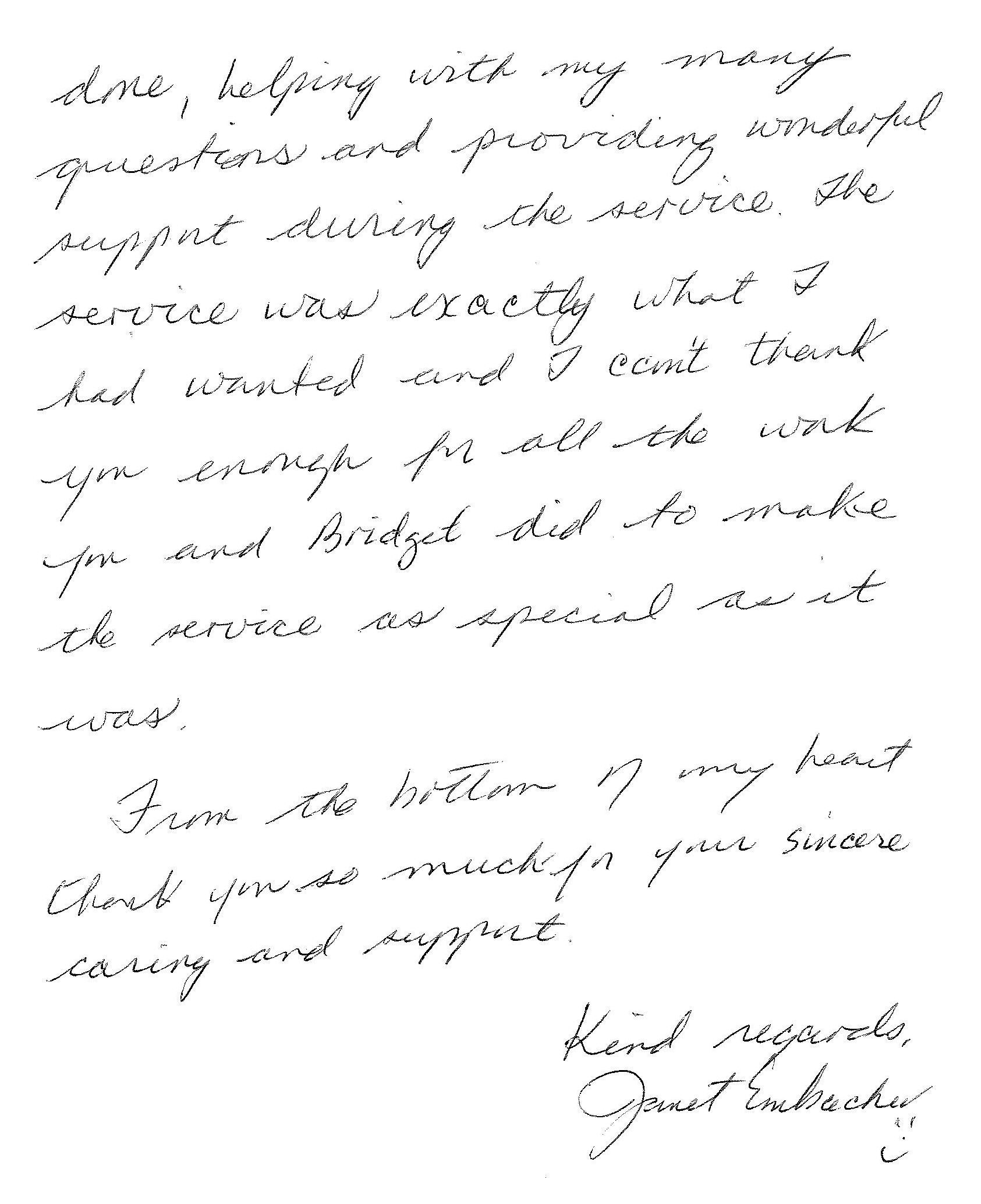 It is our greatest pleasure to hear from families we've served after the service is over. We receive many letters, cards and emails thanking us for our care and attention during their time of need and those words warm our hearts and affirm that we are truly here to serve.