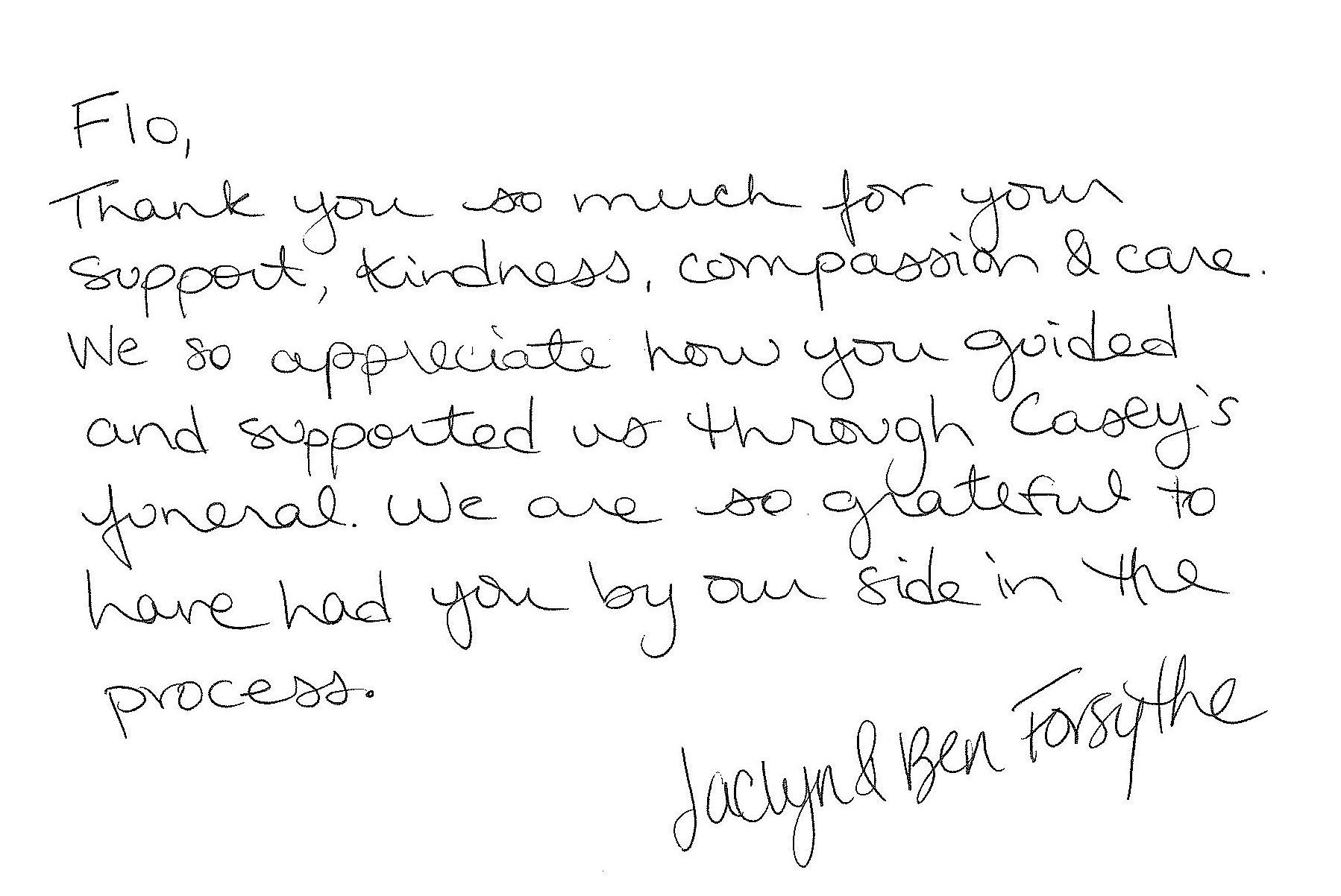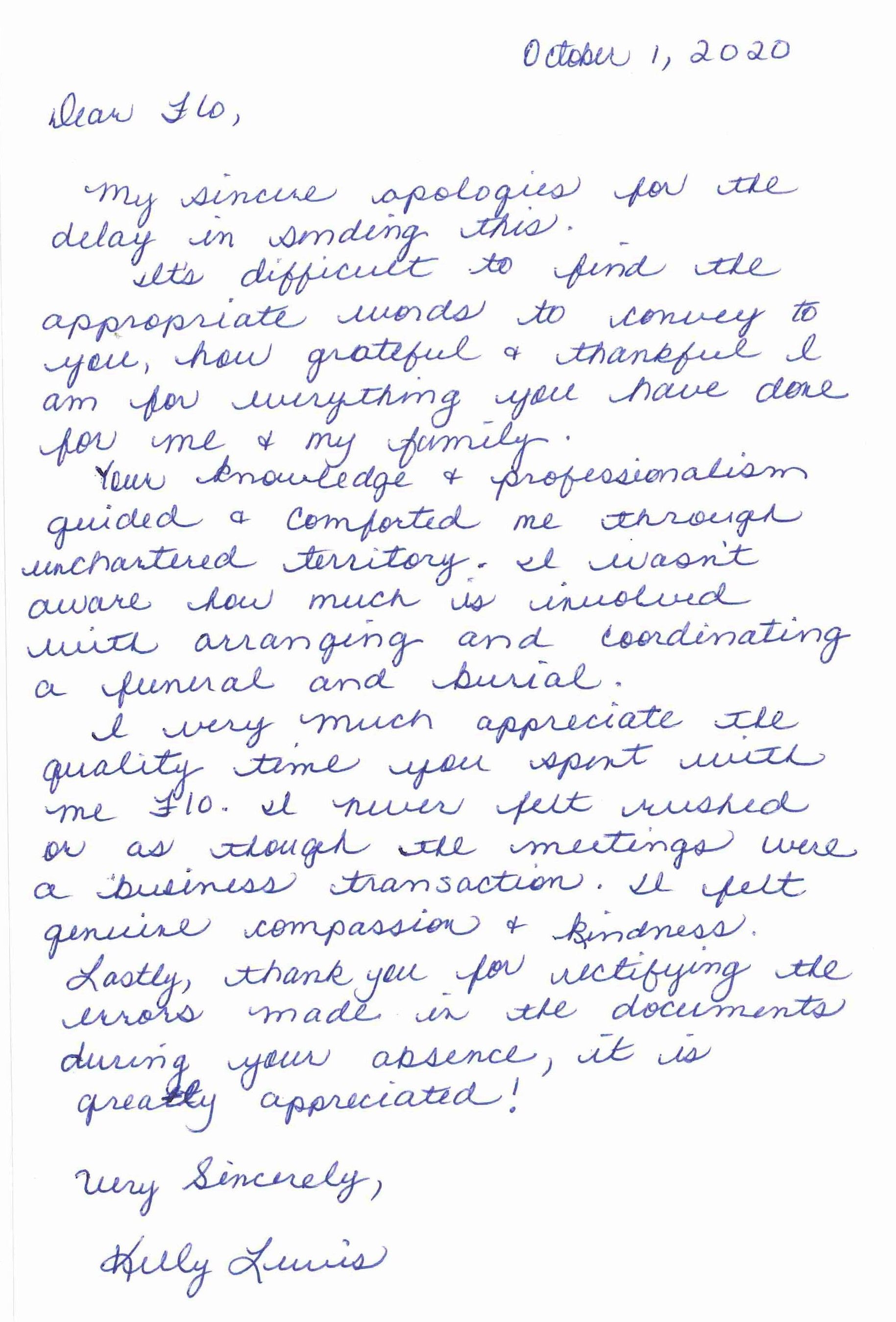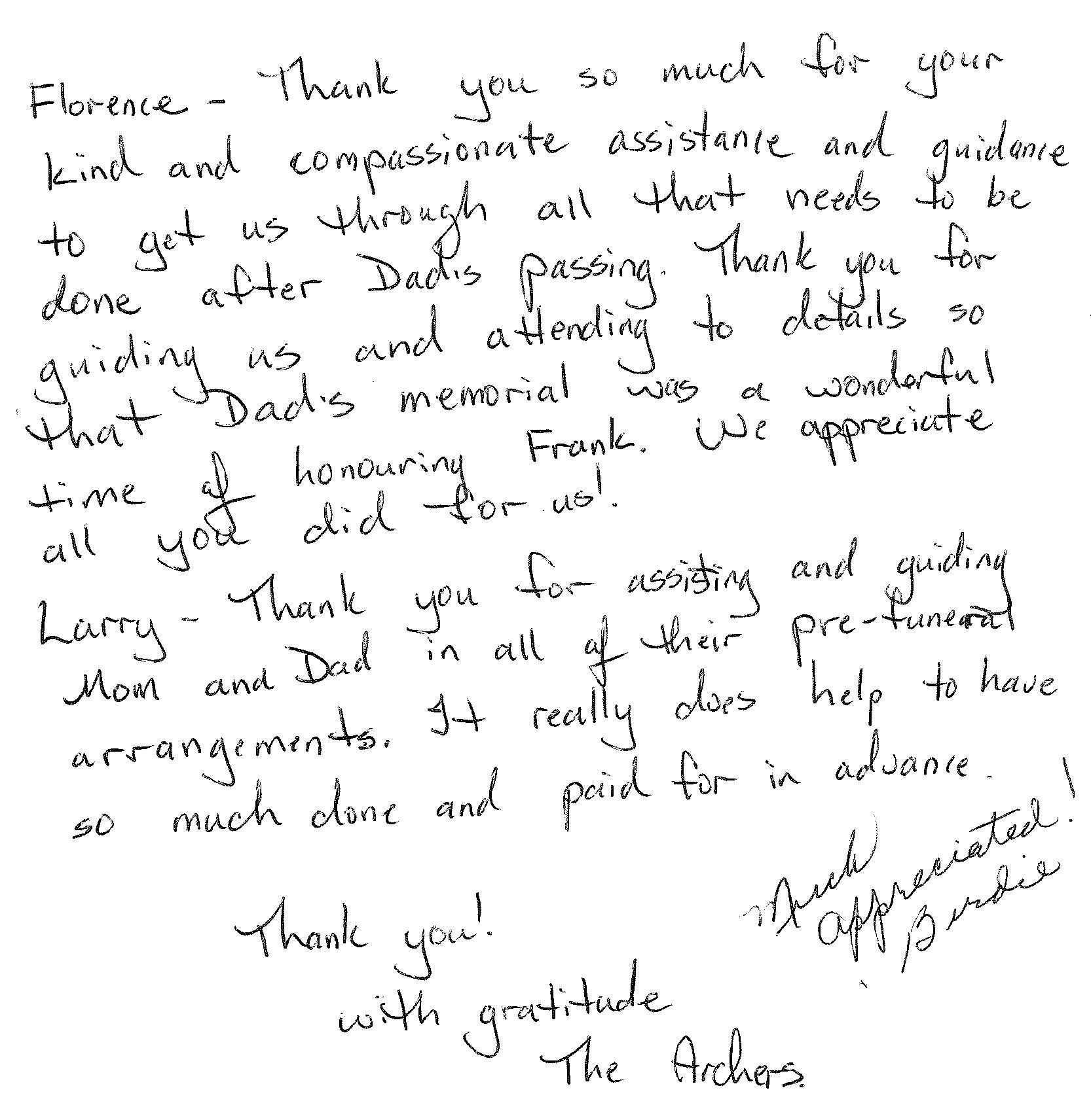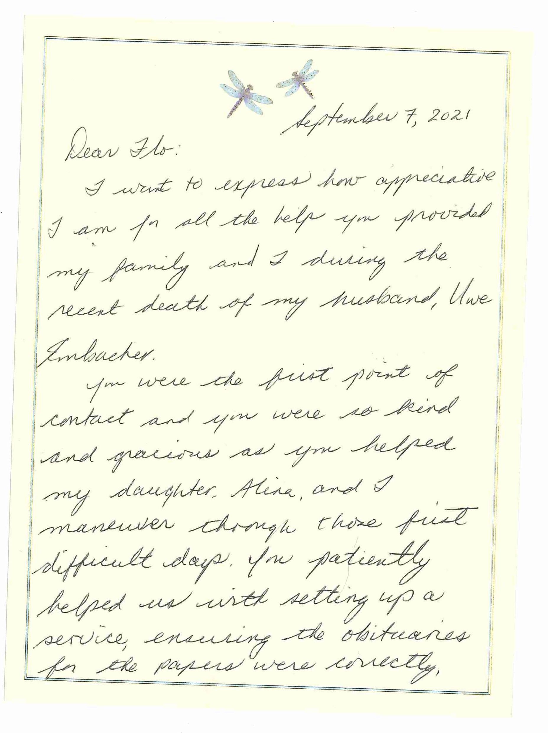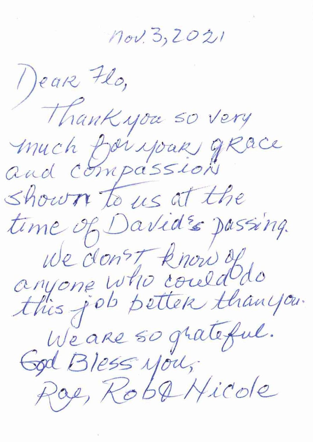 It is our greatest pleasure to hear from families we've served after the service is over. We receive many letters, cards and emails thanking us for our care and attention during their time of need and those words warm our hearts and affirm that we are truly here to serve.