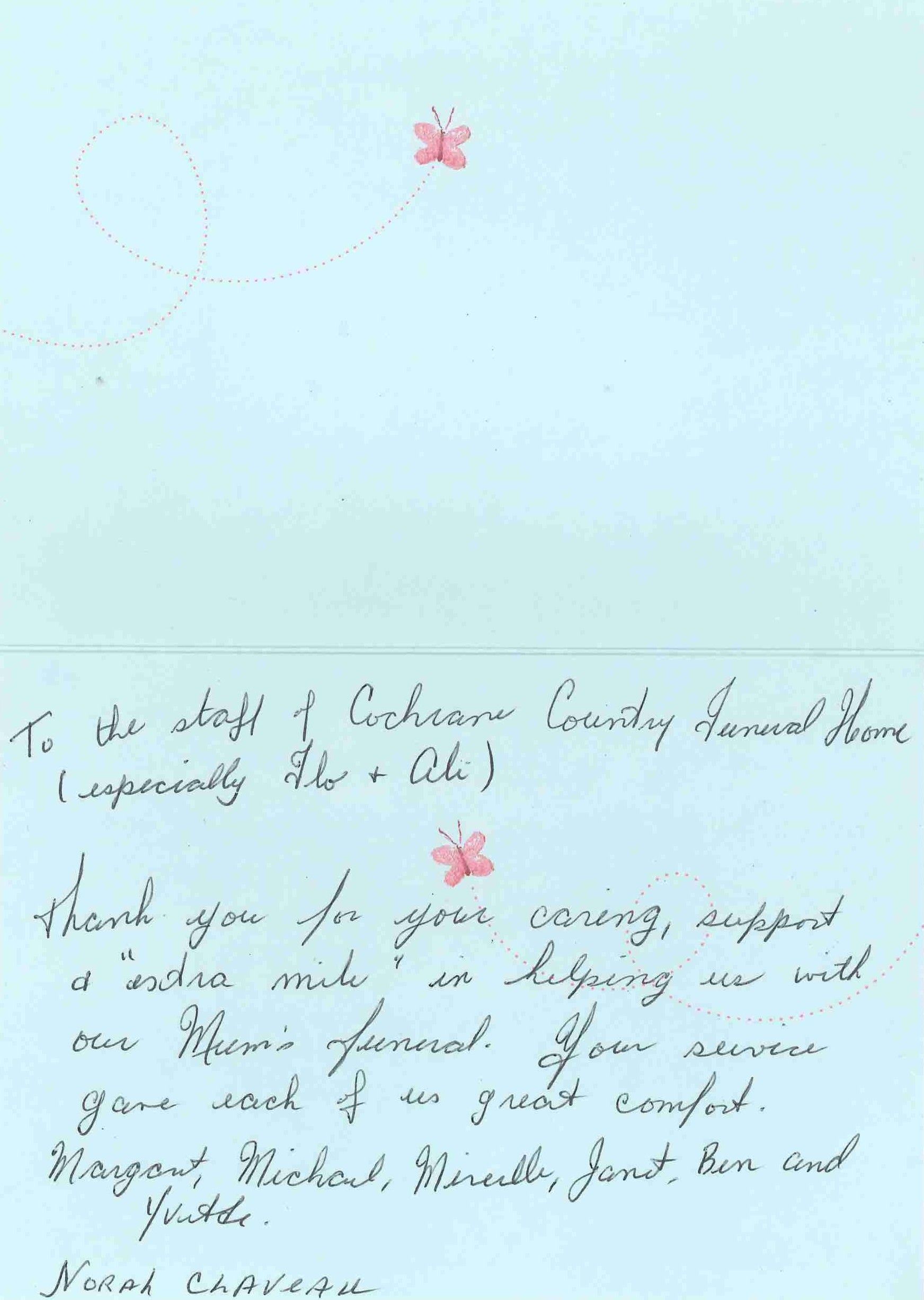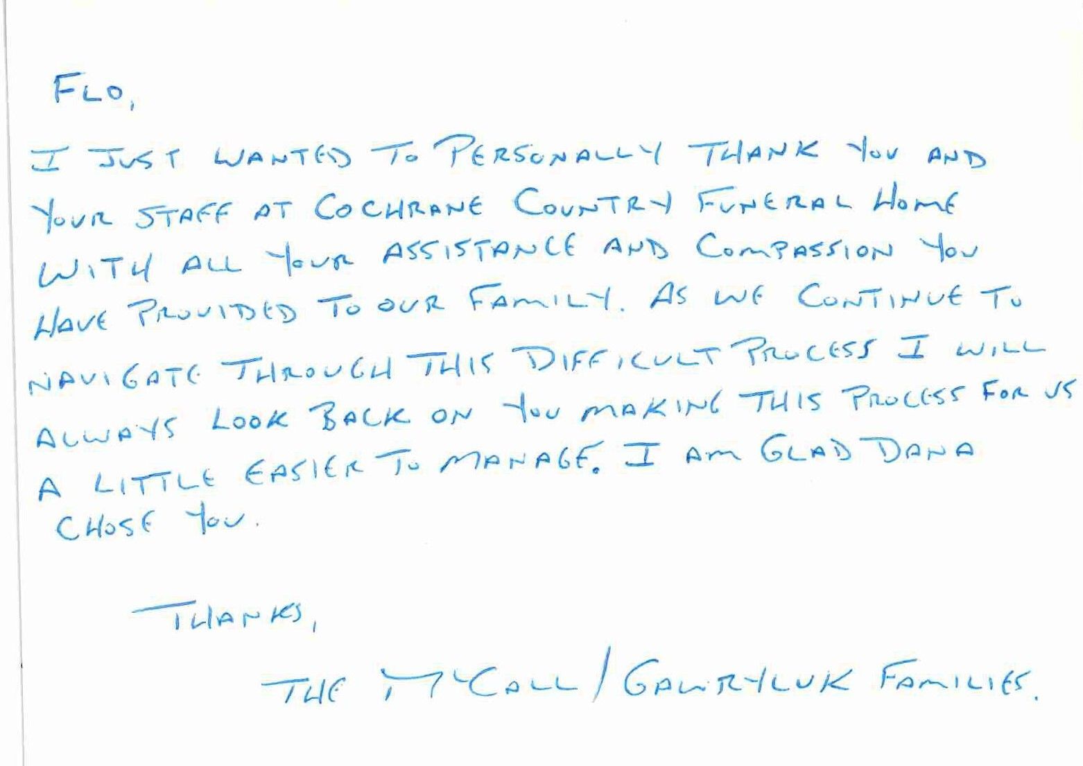 I wanted to ensure our expressions of gratitude were received by the owners and managers of the Cochrane Country Funeral Home. We, (my father, Ed and brother Ben Johnson and I, Carly Davies) would like to send a note to thank Tammy or (Tami) Ellison. She was great to deal with. She was extremely helpful in every way and even told us about a lot of options we didn't know about. Tammy knew what we needed before we did and delivered all services in a professional and sincere manner. The gentlemen that picked up my mom from her home were also amazing, they were calm and professional and truly eased my dad's heart in a very difficult time. I hope these employees are recognized for their unbelievable professionalism and cander during the most difficult time.